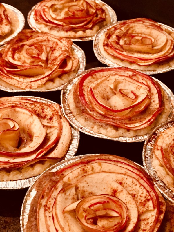 - Arrange apples (in roses or any other pattern your heart desires) by sticking them into the sour cream mixture. The sour cream mixture acts like the base or glue to hold them in place.