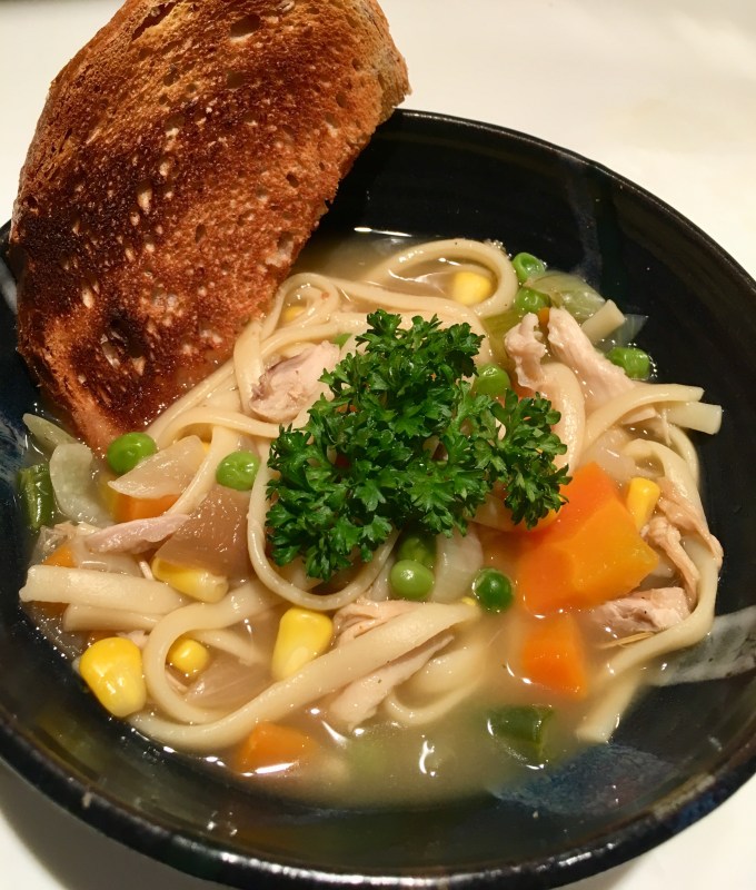 - Add leftover turkey meat and frozen veggies )and any leftover veggies from dinner that you want in the soup).